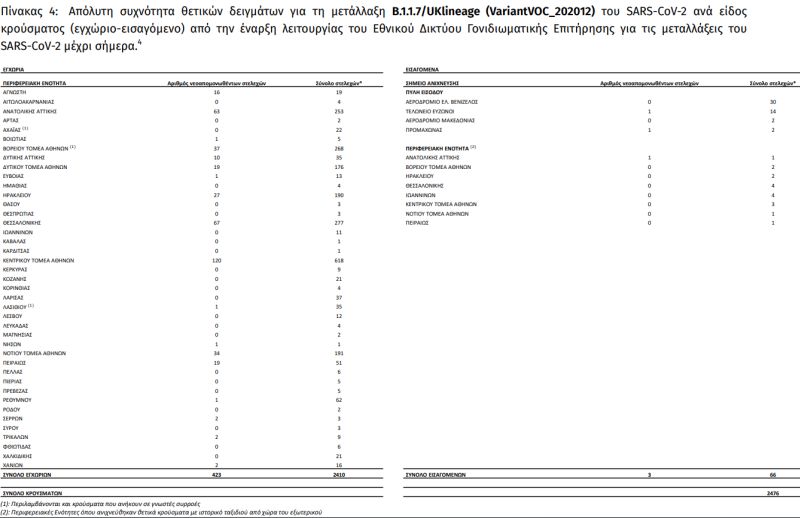 Συνολικά έχουν ταυτοποιηθεί 2.476 θετικάγια την παρουσία μετάλλαξης Β.1.1.7/UK lineage (Variant VOC_202012) (Πίνακας 4) και 55 θετικά για την παρουσία μετάλλαξης B.1.351/South Africa (Variant 501.V2) από την έναρξη λειτουργίας του Εθνικού Δικτύου Γονιδιωματικής Επιτήρησης για τις μεταλλάξεις του SARS- CoV-2 έως σήμερα. Τα 55 θετικά στελέχη για την παρουσία μετάλλαξης Lineage B.1.351/South Africa (Variant 501.V2) είναι όλα εγχώρια, εκ των οποίων 47 προέρχονται από την Περιφερειακή Ενότητα Θεσσαλονίκης, 2 από την Περιφερειακή Ενότητα Ιωαννίνων, 5 από την Περιφέρεια Αττικής και 1 από την Περιφέρεια Κρήτης.