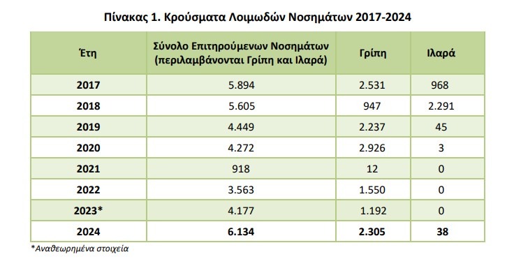 Η λοίμωξη από τον ιό του Δυτικού Νείλου κατέγραψε συνολικά με 220 κρούσματα, εμφανίζοντας θερινή εποχικότητα, καθώς τα περιστατικά περιορίζονται στους μήνες από Ιούνιο έως Οκτώβριο. Σε σχέση με το 2023 η λοίμωξη αυξήθηκε κατά 35,8%