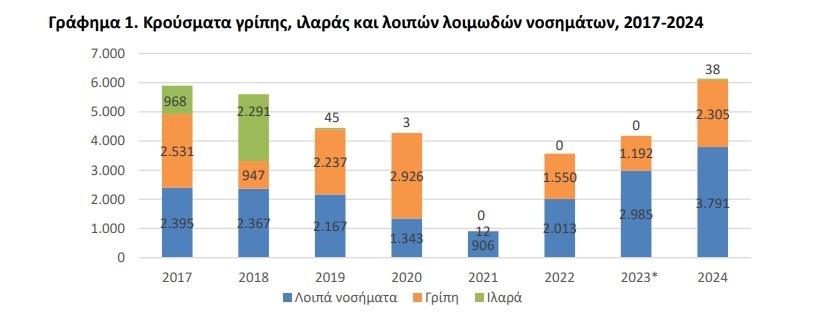 Τη μεγαλύτερη αύξηση (93,4%) παρουσίασαν τα εργαστηριακά επιβεβαιωμένα κρούσματα γρίπης (2.305 από 1.192) ενώ καταγράφηκαν και 38 κρούσματα ιλαράς.