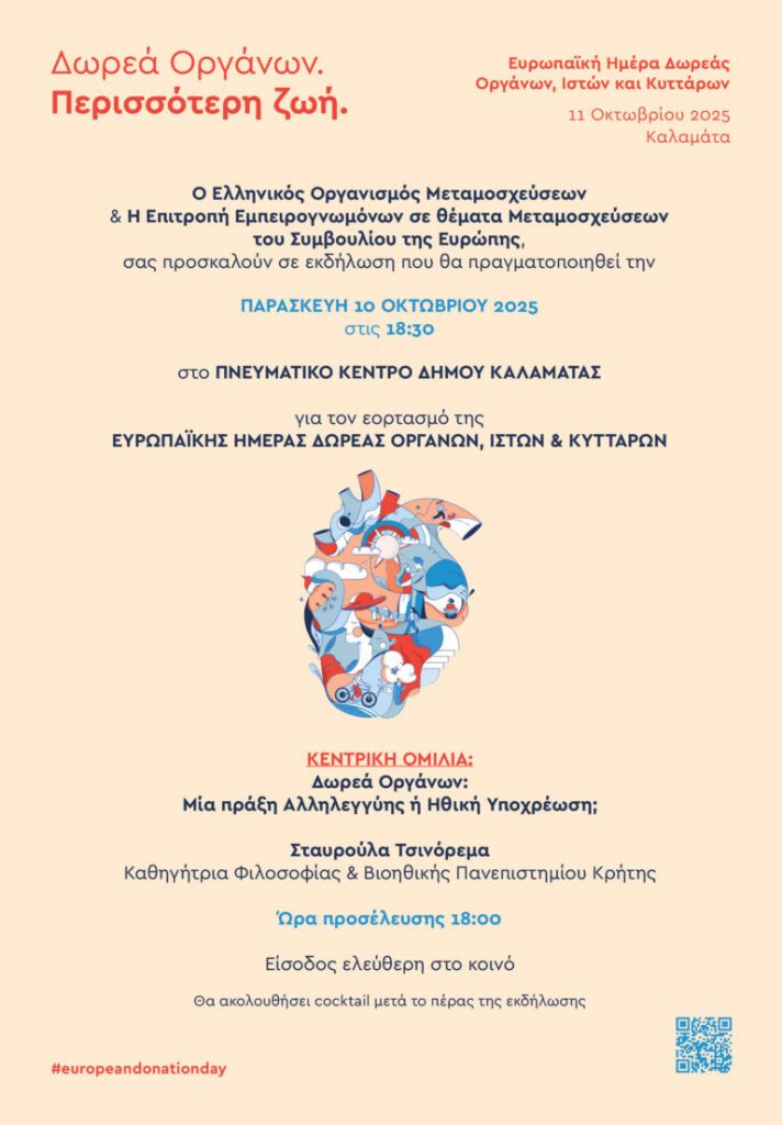 Το Σάββατο 11 Οκτωβρίου του 2025, η Ελλάδα έχει την τιμή να φιλοξενεί στην Καλαμάτα την «Ευρωπαϊκή Ημέρα Δωρεάς Οργάνων, Ιστών και Κυττάρων», υπό την αιγίδα της Βουλής των Ελλήνων. Με το μήνυμα «Δωρεά Οργάνων, Περισσότερη Ζωή», το δώρο ζωής από άνθρωπο σε άνθρωπο, μπαίνει στο επίκεντρο του δημόσιου διαλόγου. Με συμβολικές δράσεις σε όλη τη χώρα, αλλά και με τις εκδηλώσεις, που διοργανώνει κάθε ευρωπαϊκή χώρα την ημέρα αυτή, το σημαντικό μήνυμα θα μεταδοθεί, με σκοπό τη δημιουργία περισσότερων ευκαιριών ζωής για κάθε Ευρωπαίο πολίτη.