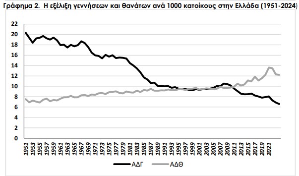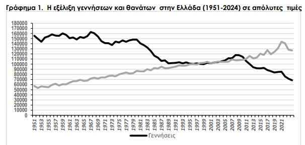 Ωστόσο, από τις αρχές της δεκαετίας του 2010 η κατάσταση αντιστράφηκε: Οι θάνατοι ξεπέρασαν σταθερά τις γεννήσεις (+4,3 χιλ. το 2011, +58,5 χιλ. το 2024), οδηγώντας σε αρνητικά φυσικά ισοζύγια που, συνολικά, φτάνουν τους 510.000 περισσότερους θανάτους από γεννήσεις την περίοδο 2011–2024. Η ΕΛΣΤΑΤ εκτιμά ότι η Ελλάδα έχει χάσει περίπου 715.000 κατοίκους από τη μείωση του πληθυσμού, κυρίως λόγω αυτής της δημογραφικής τάσης.