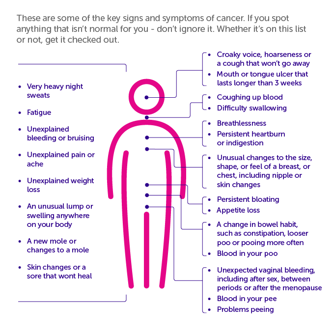 «Ο καρκίνος μπορεί να εκδηλωθεί στους ανθρώπους με διαφορετικούς τρόπους. Η συμπτωματολογία ενός ατόμου μπορεί να διαφέρει από άλλων, ενώ κάποιοι είναι ασυμπτωματικοί. Είναι σημαντικό να γνωρίζετε τι είναι φυσιολογικό σε εσάς και να μιλήσετε στο γιατρό σας εάν παρατηρήσετε ασυνήθιστες αλλαγές ή κάτι που δεν λέει να φύγει. Αυτό μπορεί να βοηθήσει στη διάγνωση του καρκίνου σε πρώιμο στάδιο, όταν η θεραπεία έχει περισσότερες πιθανότητες επιτυχίας» αναφέρει στη σελίδα του το βρετανικό Ινστιτούτο Έρευνας για τον Καρκίνο (Cancer Research UK).